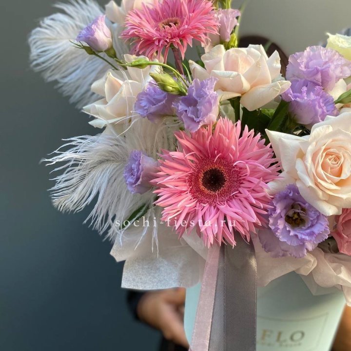 Орхидея и эустома в шляпной коробке