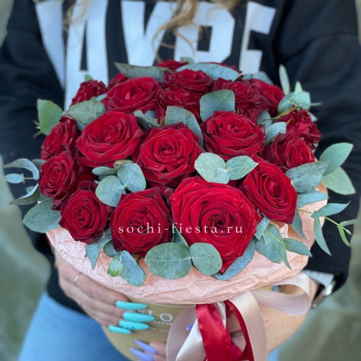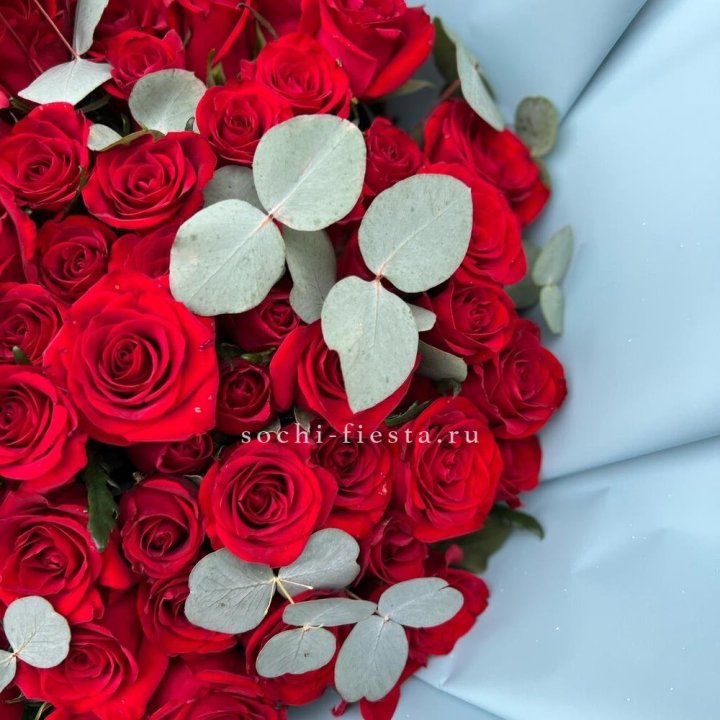 25 красных роз с эвкалиптом