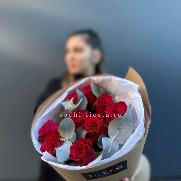 9 роз с эвкалиптом