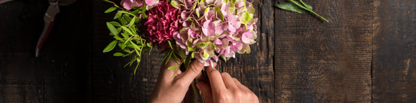 Авторский букет в составе которого гортензия, одноголовые хризантемы, кустовые розы, альстромерии, лента и дизайнерская пленка.