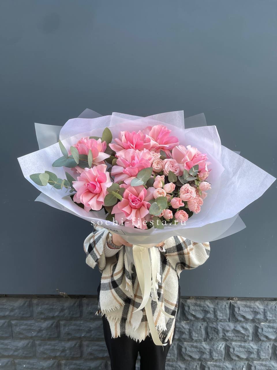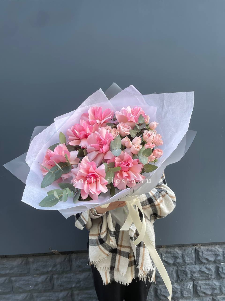Состав: розовая гортензия, белые ирисы (или эустома), лента, дизайнерская упаковка