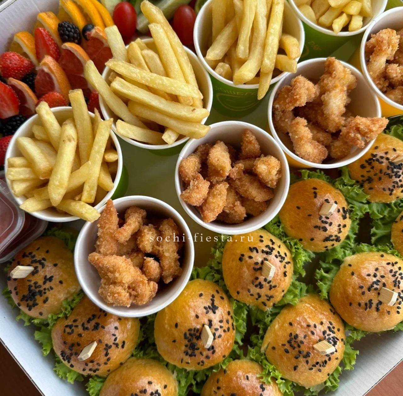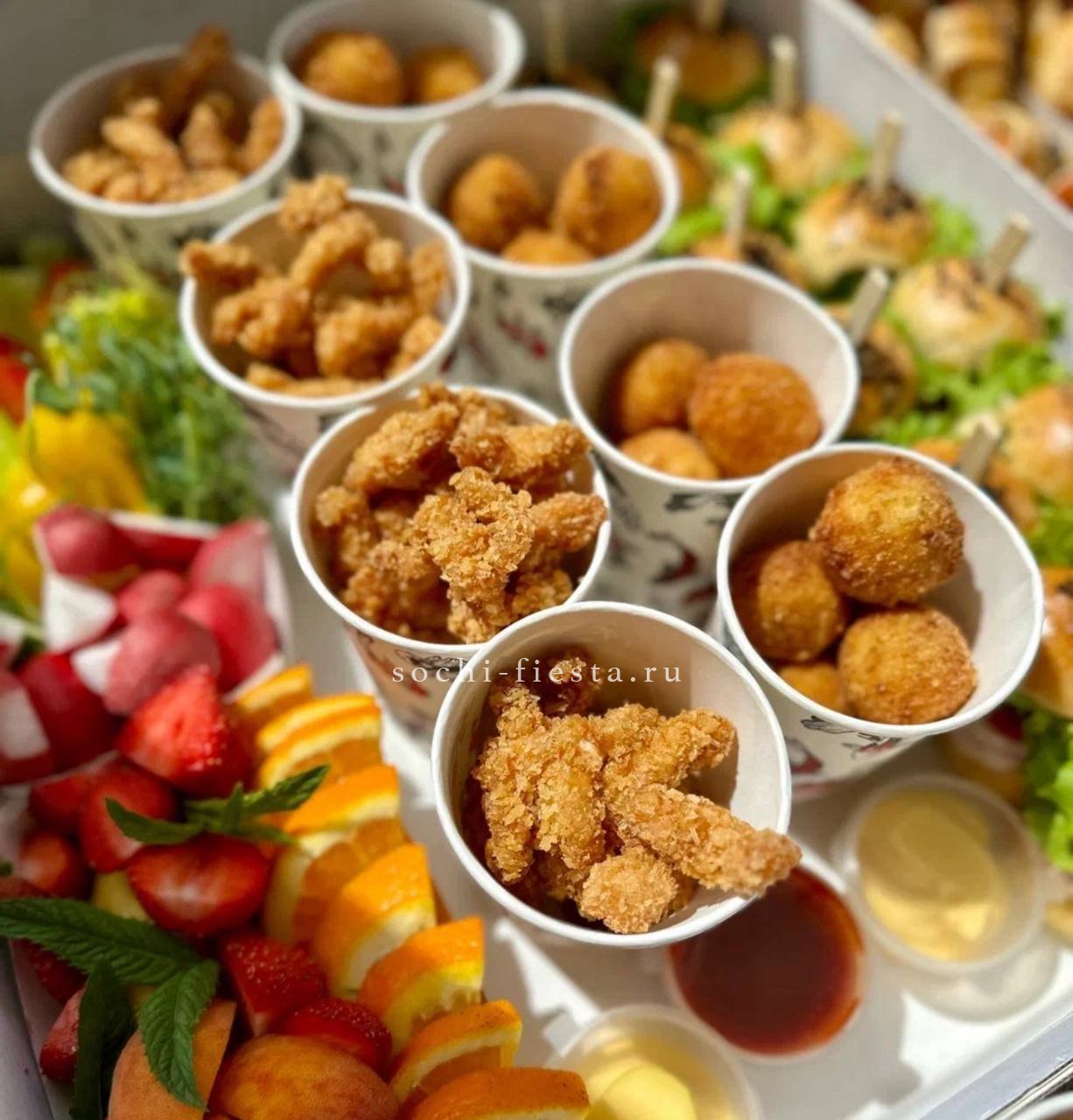 Картофельные шарики, подаются в стаканчиках - 4 стаканчика по 5 шт. Куриные нагетсы в кукурузной панировке, в стаканчиках - 4 стакана по 6 шт.