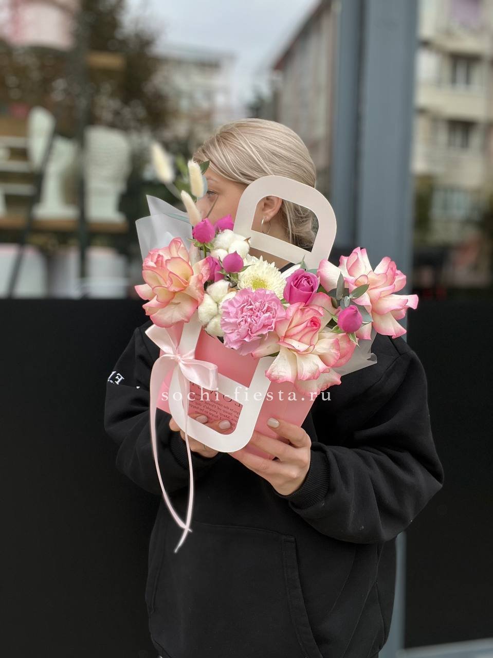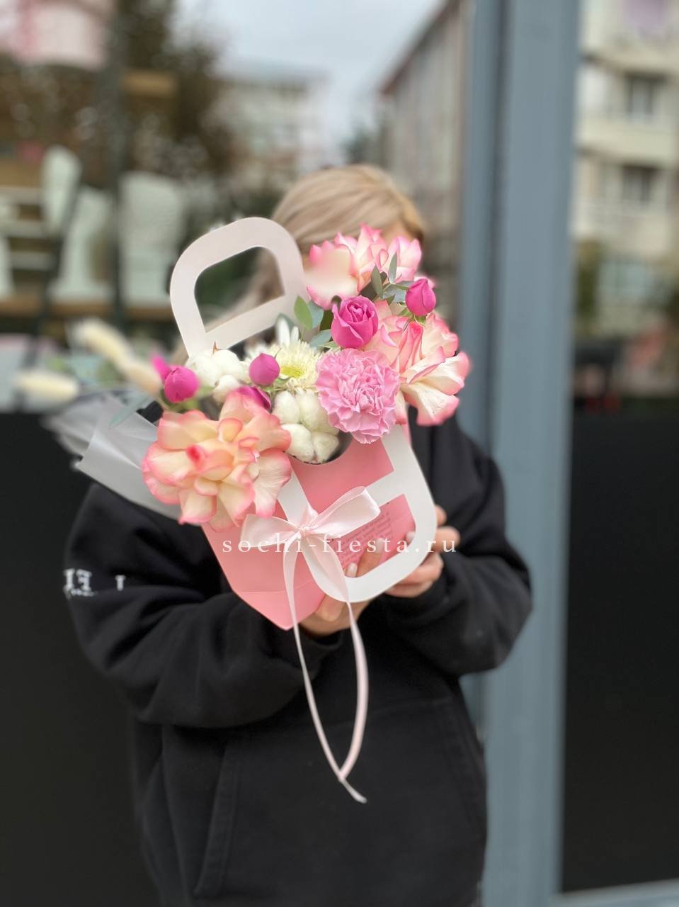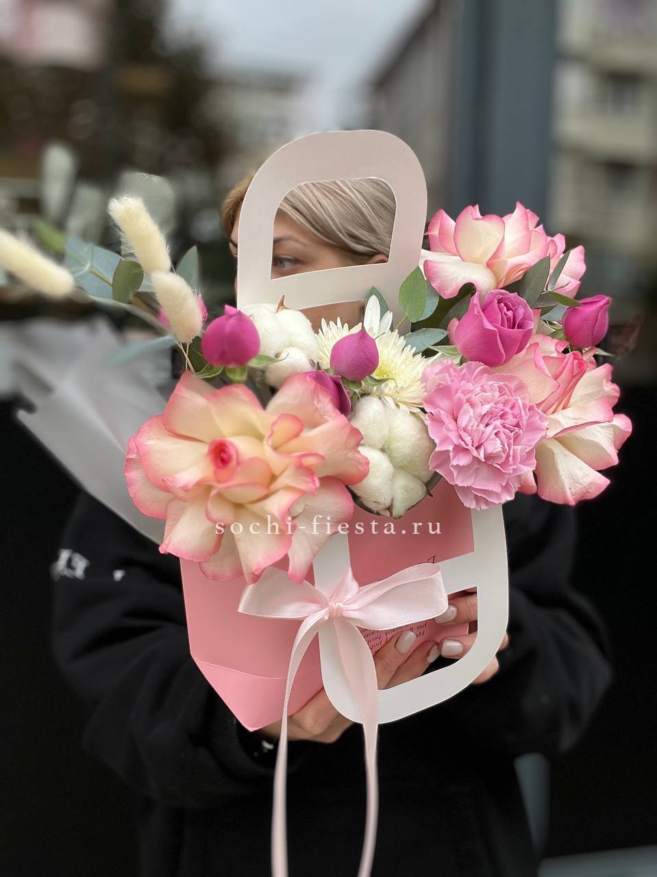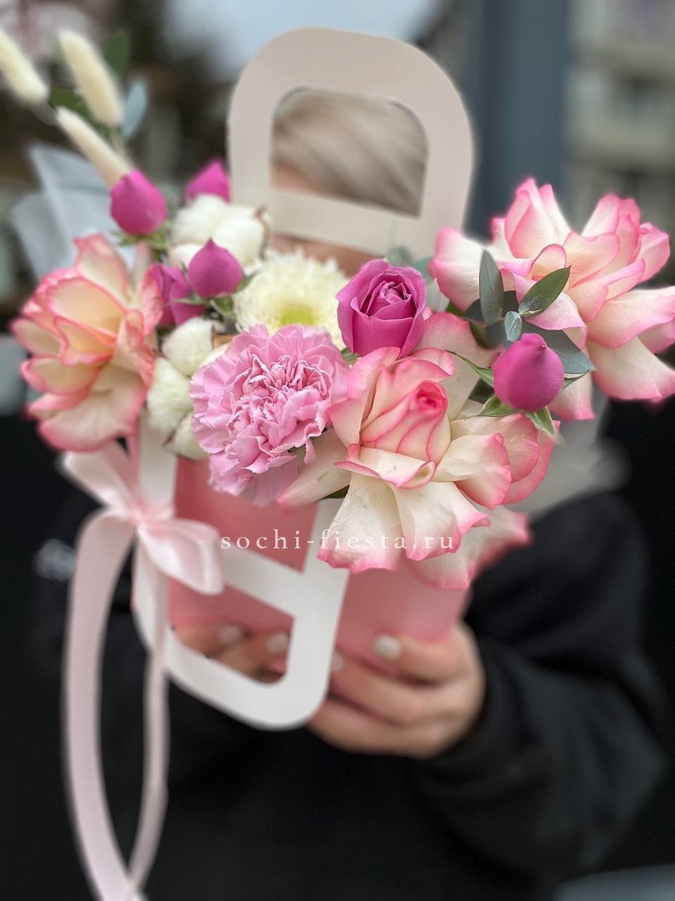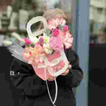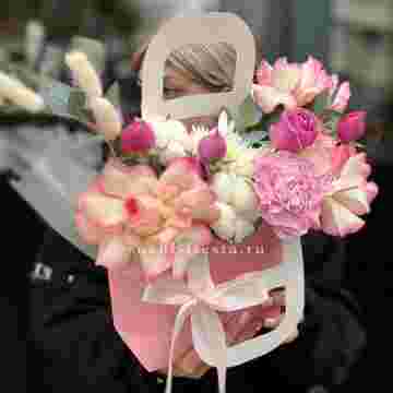 Состав: джумилия, гербера, мисти баблс, диантус, хлопок, лагурус, сумочка