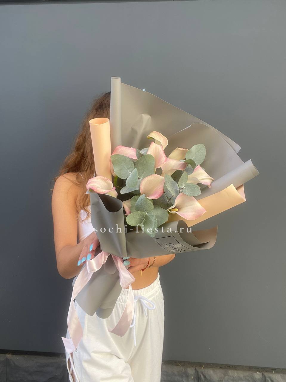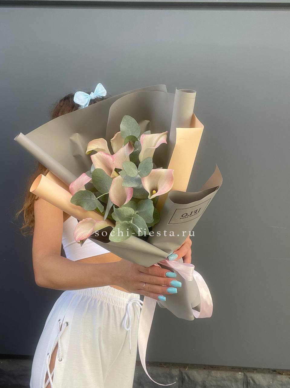 Состав: каллы - 9шт., декоративная зелень, лента