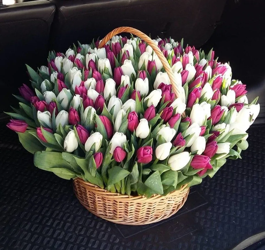 Состав: 151 белый тюльпан MIX, плетеная корзина