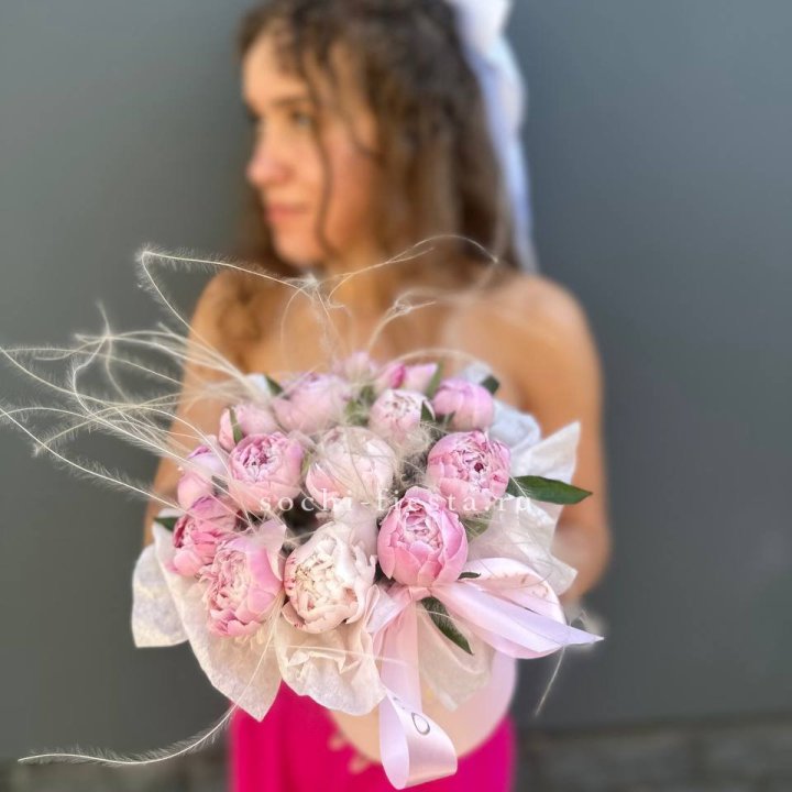15 пионов в джутовом кашпо